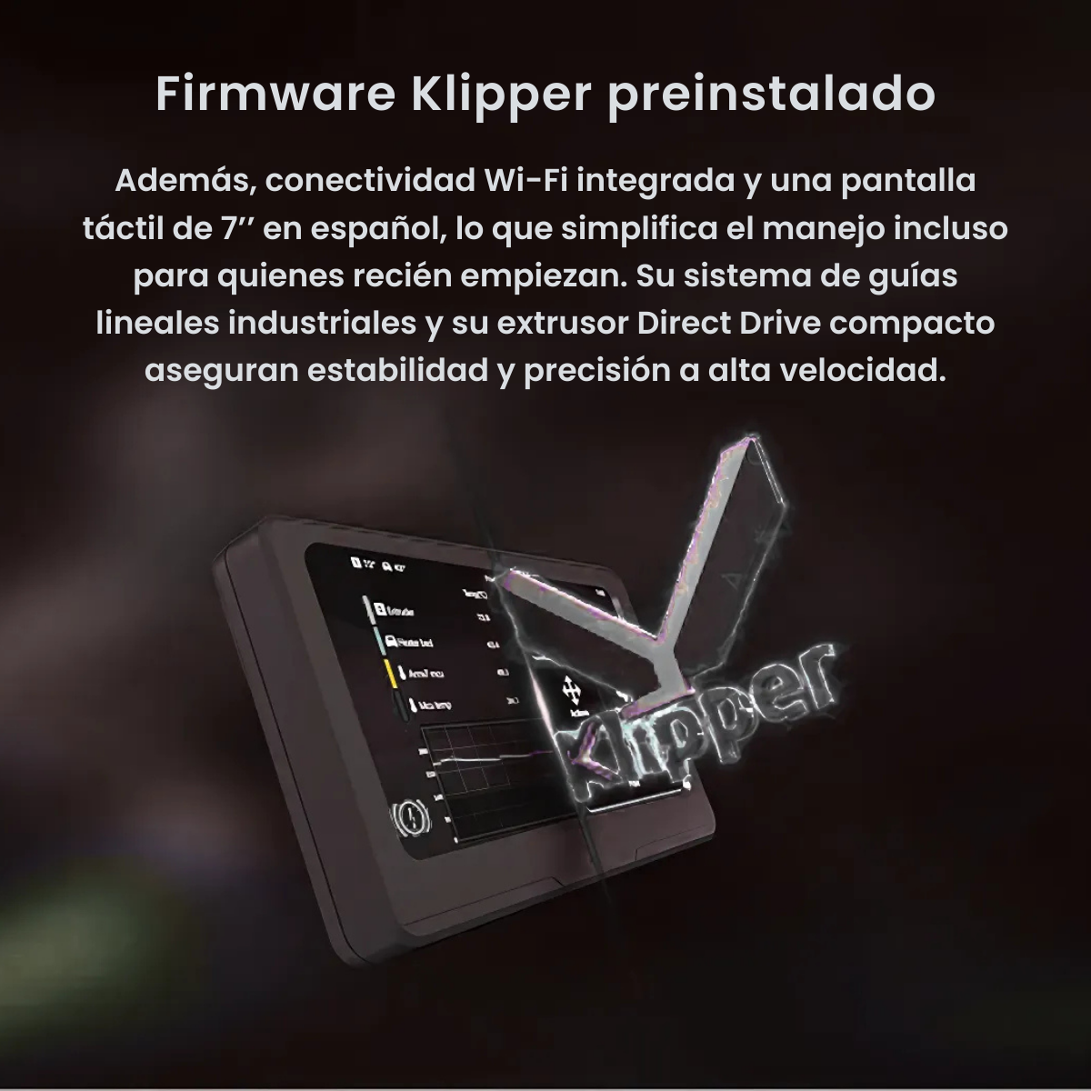 La impresora viene con firmware Klipper preinstalado. Klipper permite una experiencia de impresión de primera clase y garantiza una gran facilidad de uso, incluso a través del control remoto Wi-Fi.